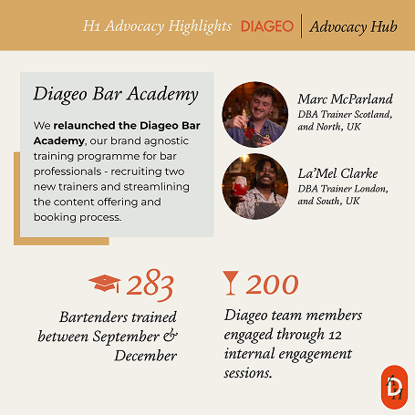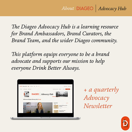 An online internal advocacy platform & ongoing inspiration content The Diageo Advocacy Hub is a learning resource for Brand Ambassadors, Brand Curators, the Brand Team, and the wider Diageo community. This platform equips everyone to be a brand advocate and supports Diageo’s mission to help everyone Drink Better Always.